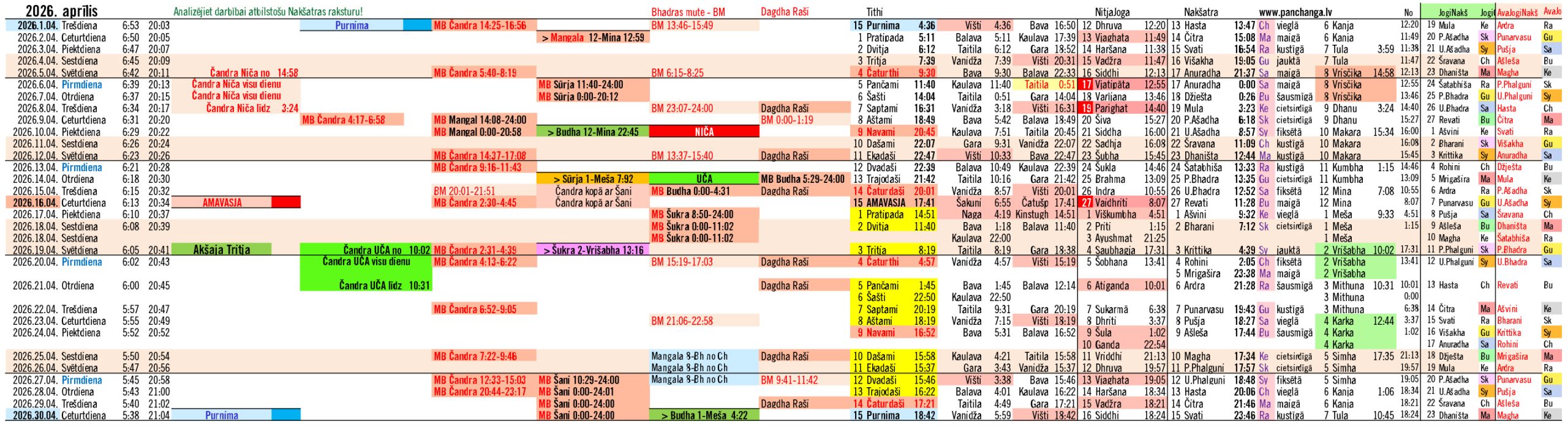 | Budha | 12-Mina | 14. apr. 5:29 līdz 15. apr. 4:31 |