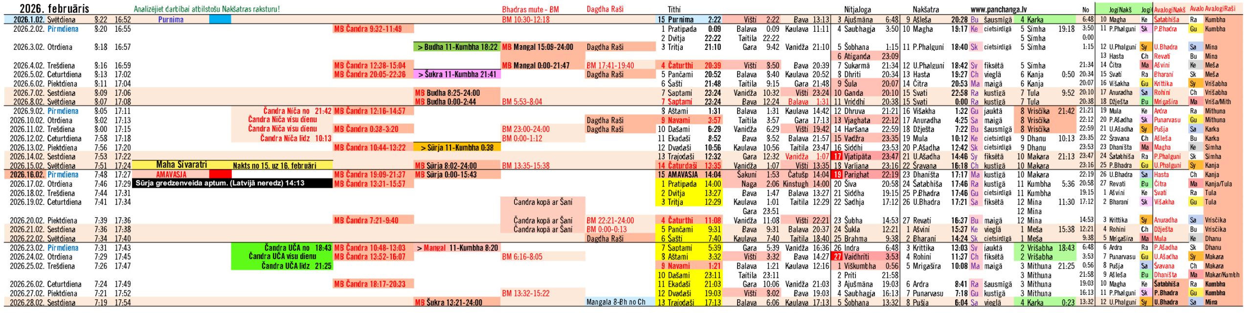 | piektdiena 13.febr. 0:38 11-Kumbha | 12. februāris no 18:14 līdz 13. febr. 7:02 |