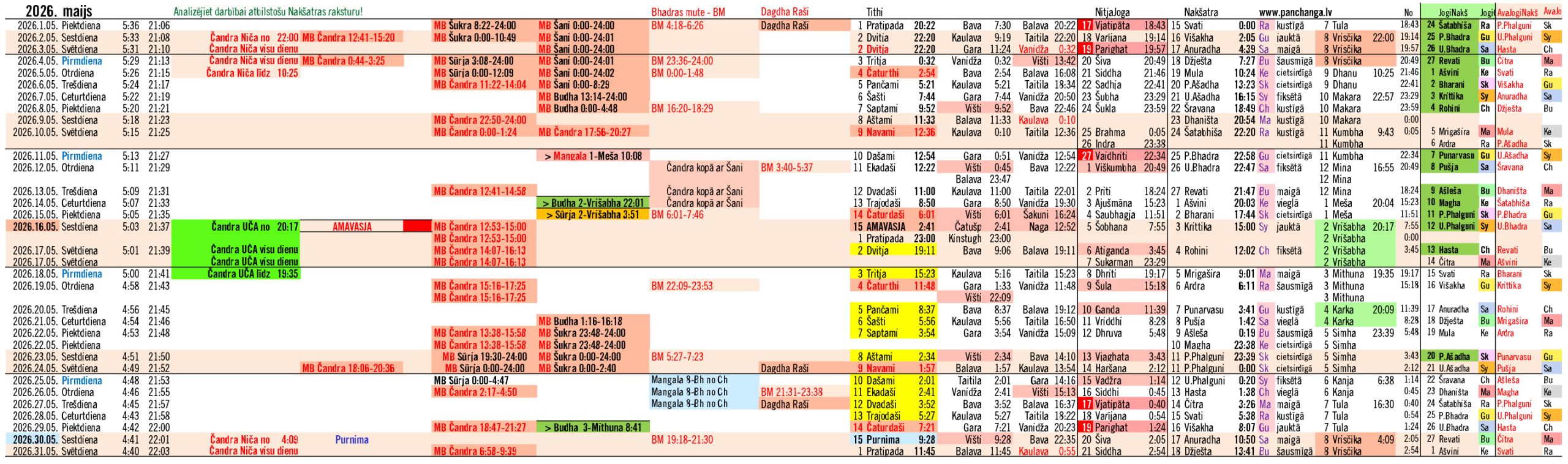 | piektdiena 15.maijs 3:51 2-Vrišabha | 14. maijs no 21:27 līdz 15. maijam 10:15 |
