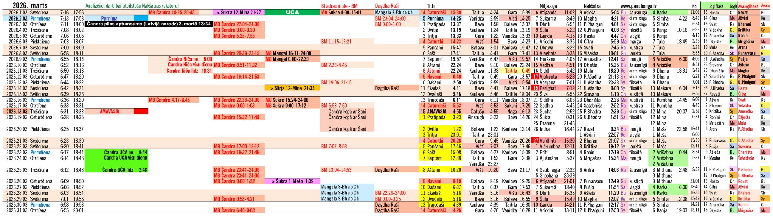 | Čandra pilns aptumsums (Latvijā neredz) | Sūrja / Saule Kumbha Raši / Ūdenvīra zīmē 24-Šatabhiša Nakšatrā 4. Padā 96-Gu Mina Navamša | Čandra Simha Raši / Lauvas zīmē 11-PurvaPhalguni Nakšatrā 2. padā 42-Bu Kanja Navamša | 3. martā | 13:34 |