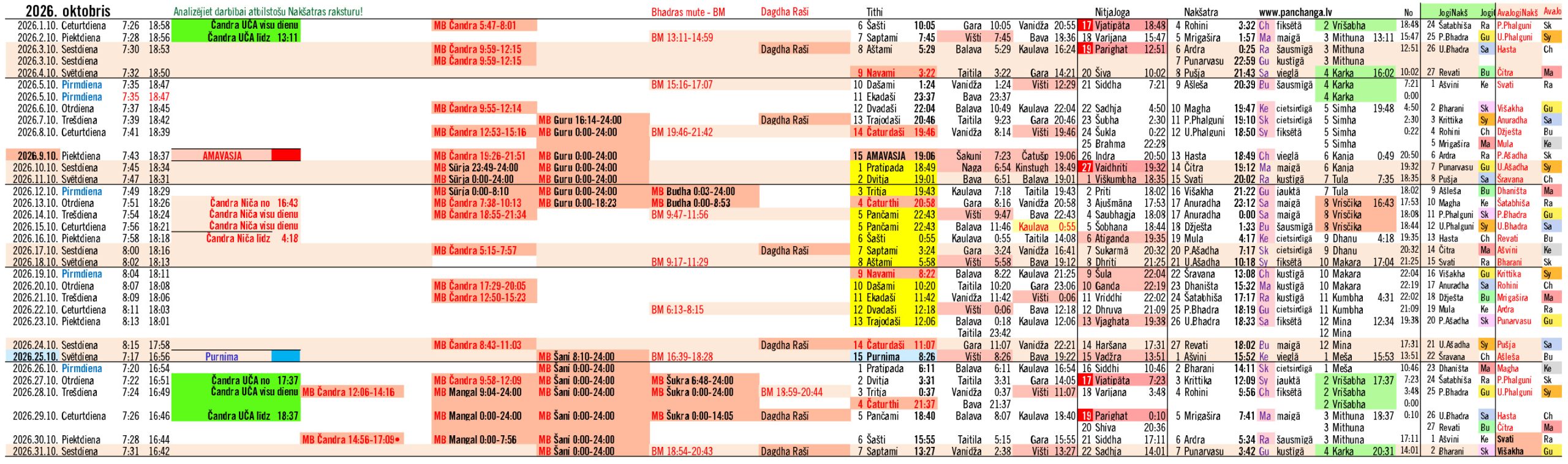 | Budha | 7-Tula | 12. okt. 0:03 līdz 13. okt. 8:53 |