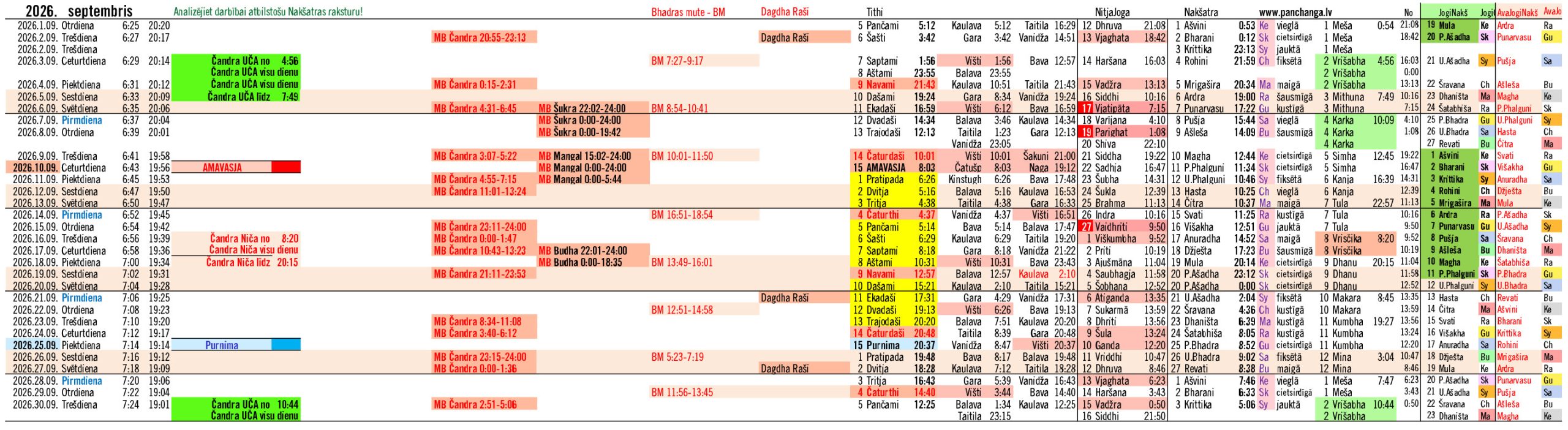 | Mangal | 3-Mithuna | 9. sept. 15:02 līdz 11. sept. 5:44 |