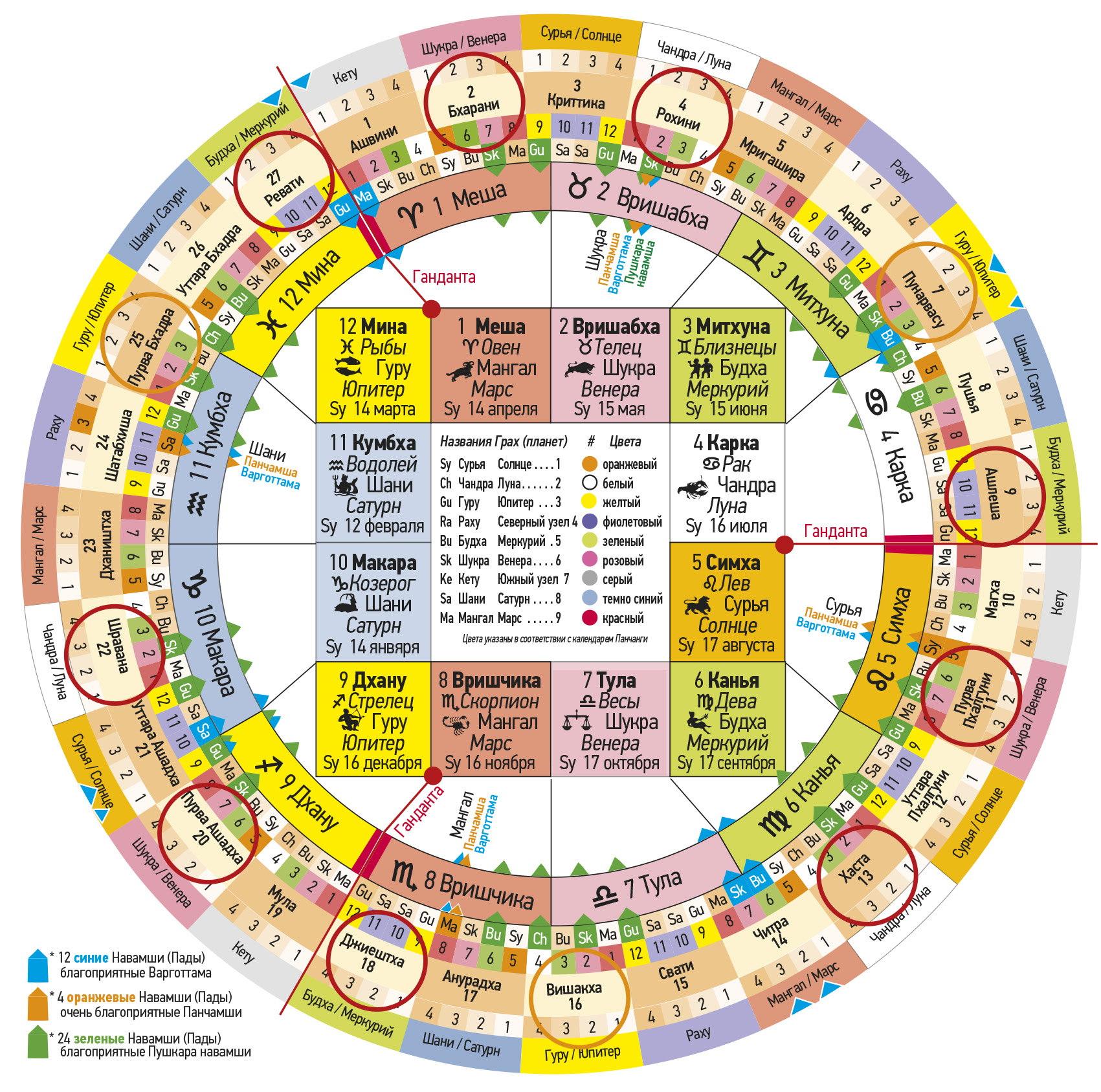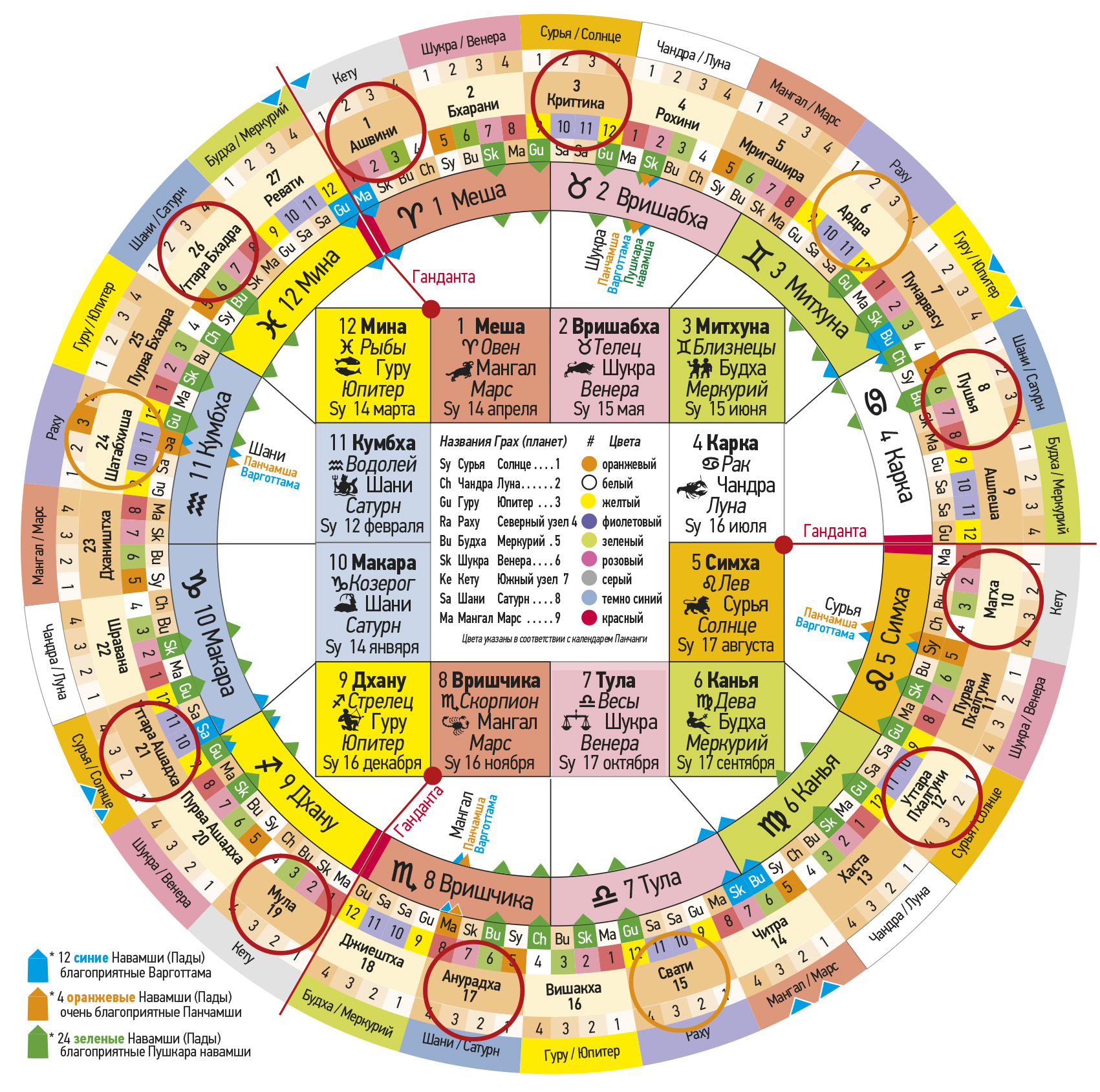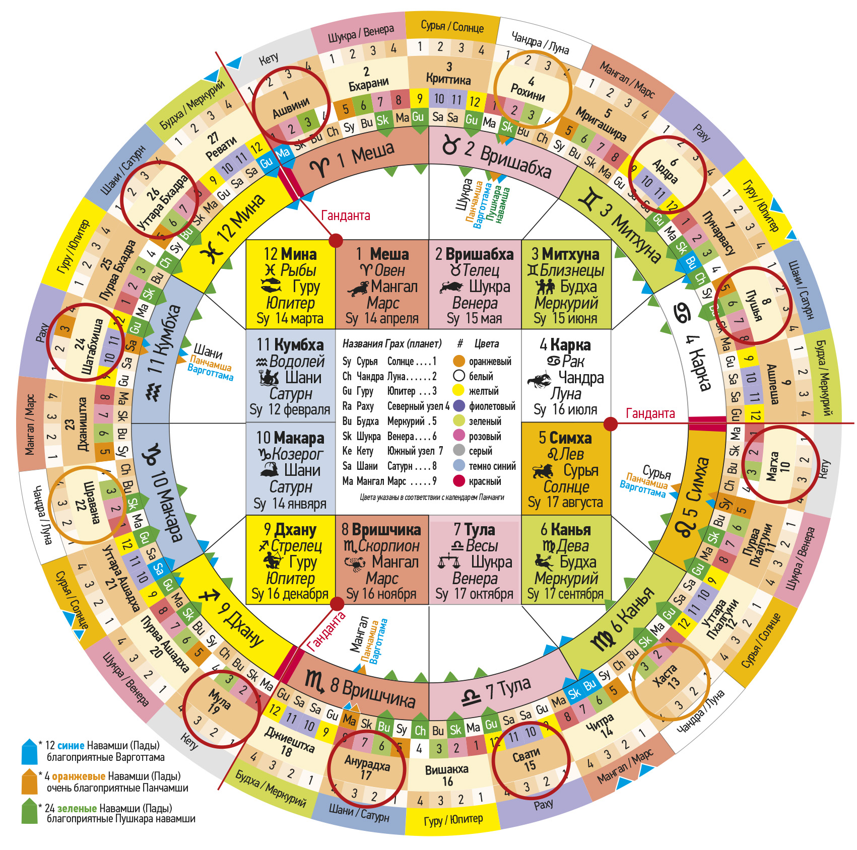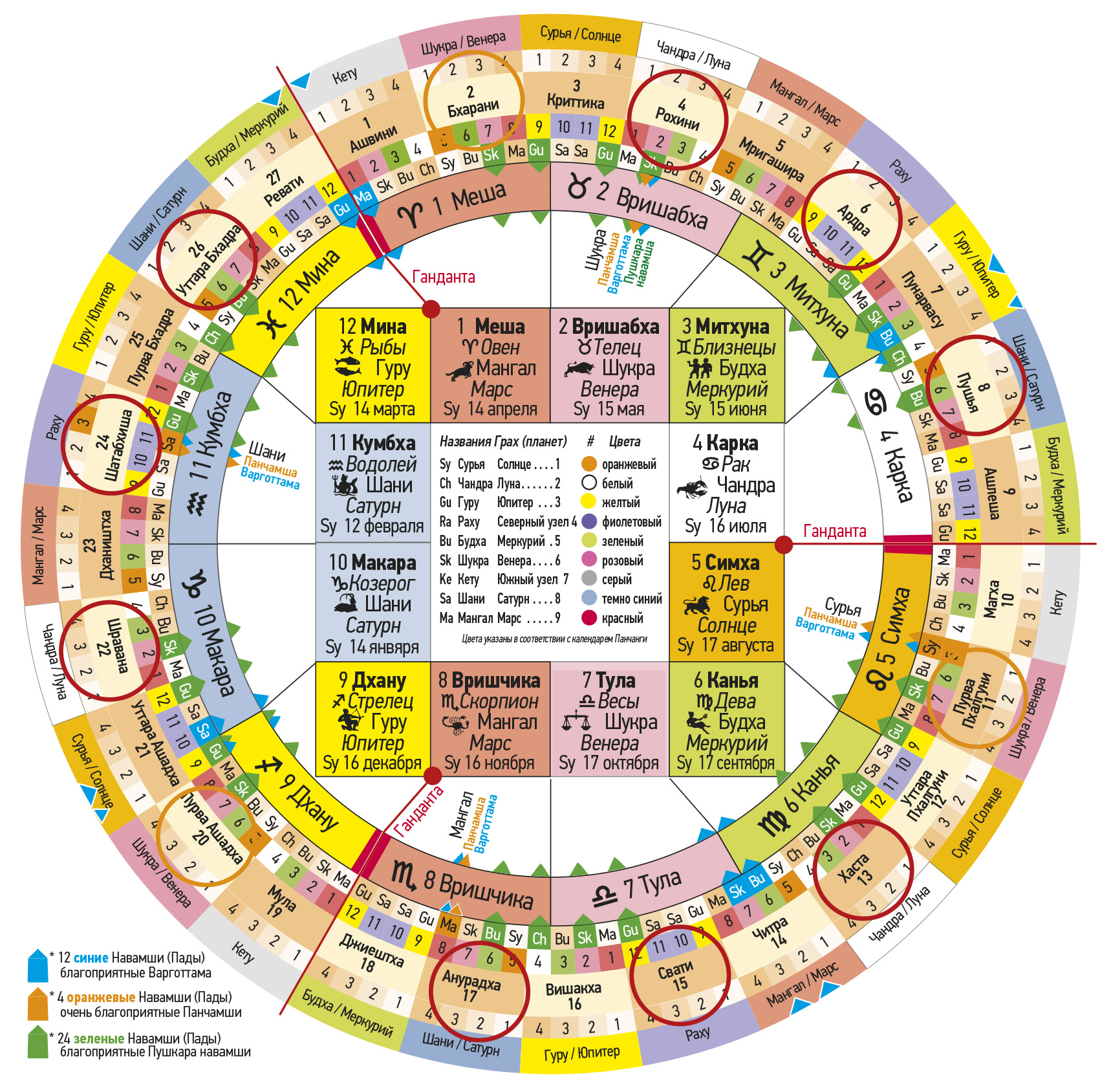 № Первая группа Джанмаркша № Вторая группа Кармаркша № Третья группа Адханаркша Тара Значение Хорошо / Плохо Управляющая планета Пожертвование 4 Рохини 13 Хаста 22 Шравана Джанма Опасность для тела Негативно Луна / Чандра Рис, овощи 5 Мригашира 14 Читра 23 Дхаништха Сампат Богатство и процветание Благоприятно Марс / Мангал 6 Ардра – Вся Накшатра15 Свати – первые 8 ч.24 Сатабхиша – нейтральнаяВипат Потери и несчастные случаи Негативно Раху Пальмовый сахар 7 Пунарвасу 16 Вишакха 25 Пурвабхадра Кшема Процветание Благоприятно Юпитер / Гуру 8 Пушья – Вся Накшатра17 Анурадха – последние 8 ч.26 Уттарабхадра – нейтральнаяПратйак Препятствия и затруднение Негативно Сатурн / Шани Соль 9 Ашлеша 18 Джйештха 27 Ревати Садхана Реализация притязаний Очень хорошо Меркурий / Будха 10 Магха – Вся Накшатра19 Мула – средние 8 ч.1 Ашвини – нейтральнаяНаидхана Опасности, несчастные случаи Очень негативно Кету Сезам, золото 11 Пурвапхалгуни 20 Пурвашадха 2 Бхарани Митра Указывает хорошее Благоприятно Венера / Шукра 12 Уттарапхалгуни 21 Уттарашадха 3 Критика Парама митра Лучший друг Очень б лагоприятн о Солнце / Сурья