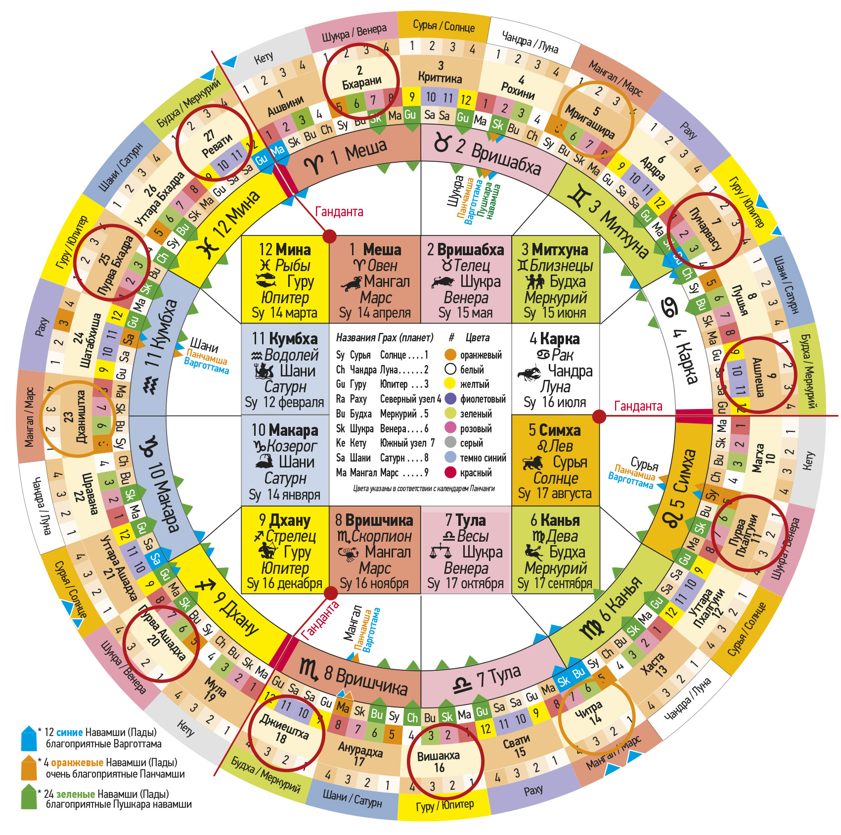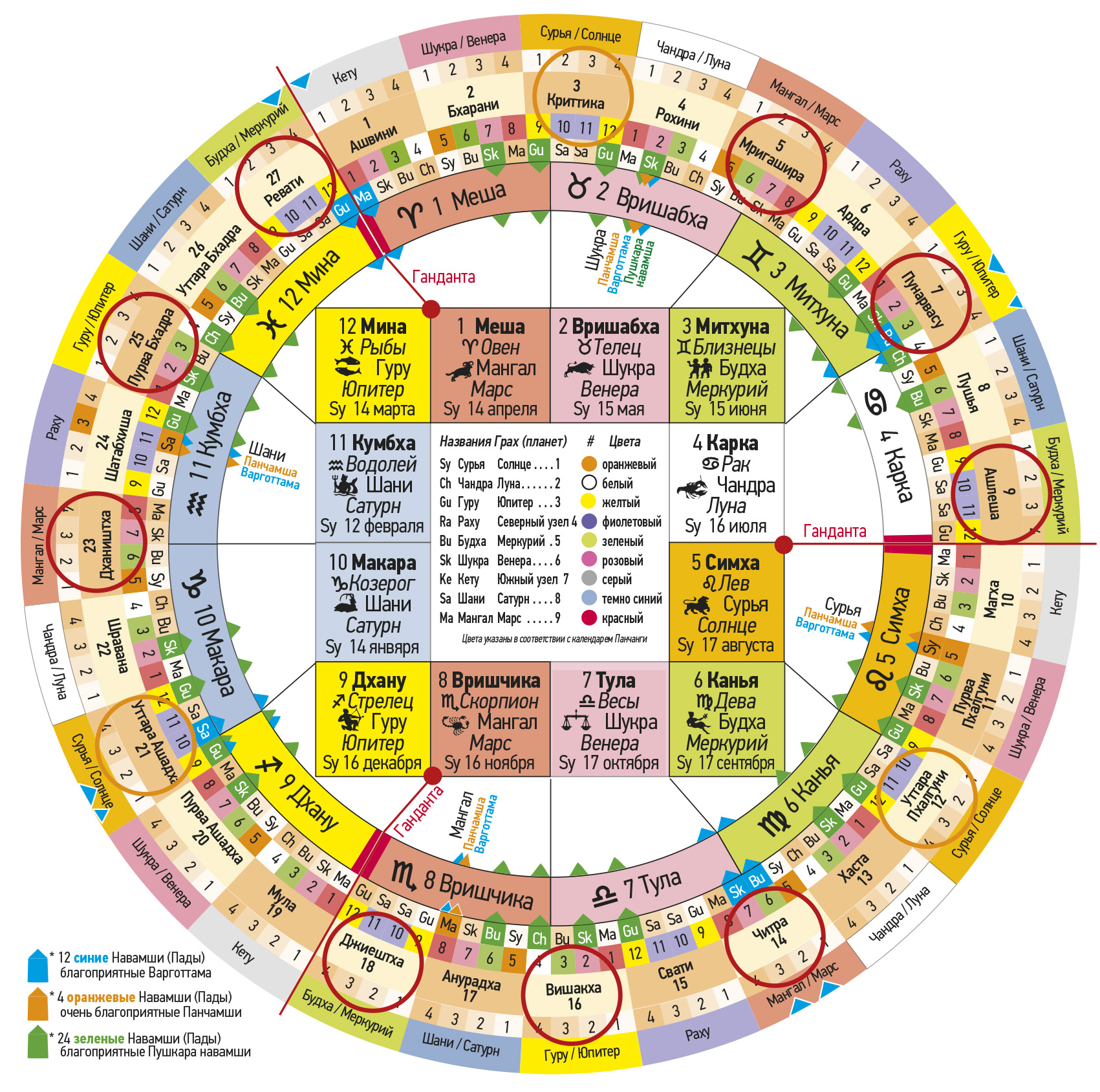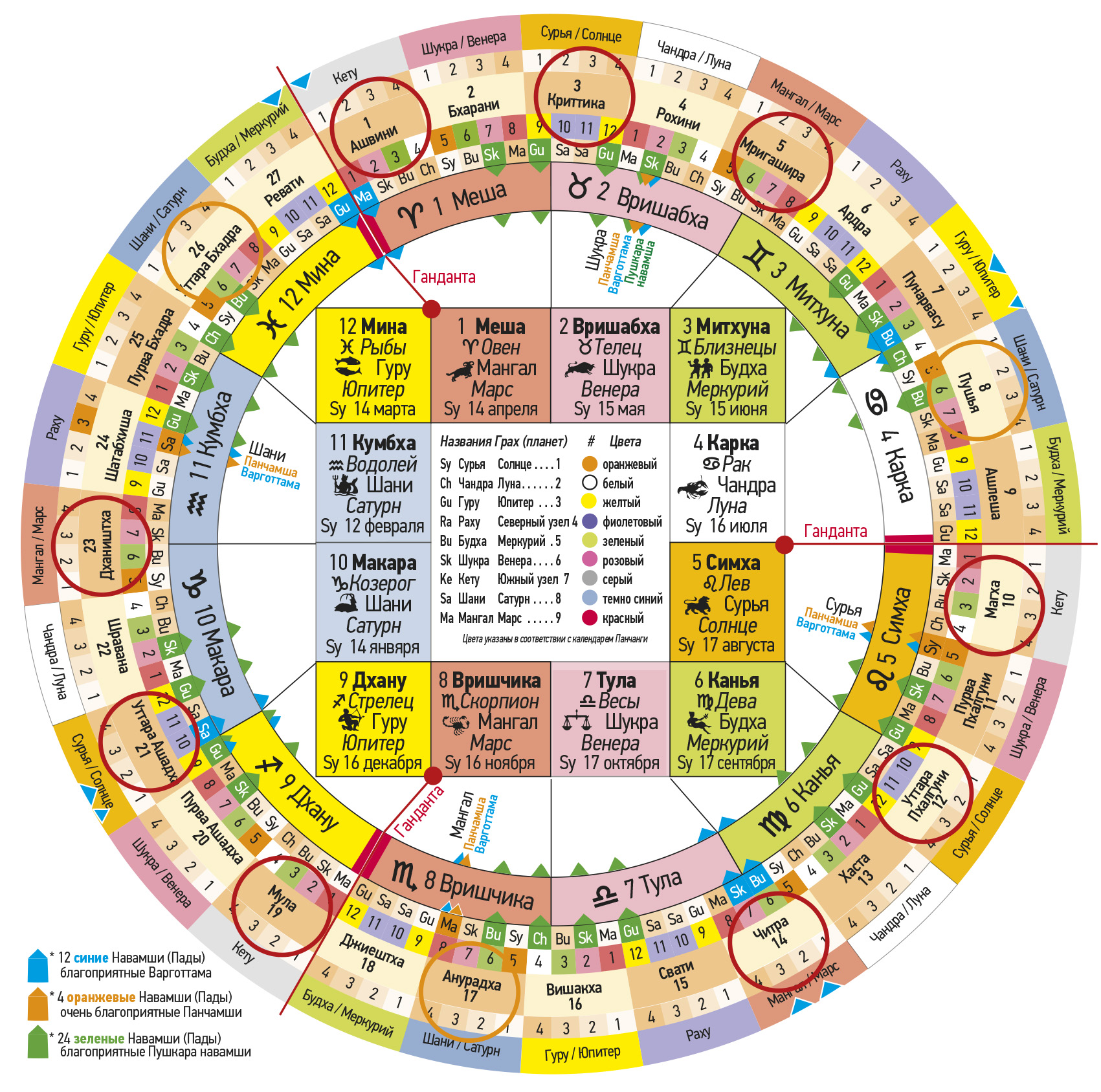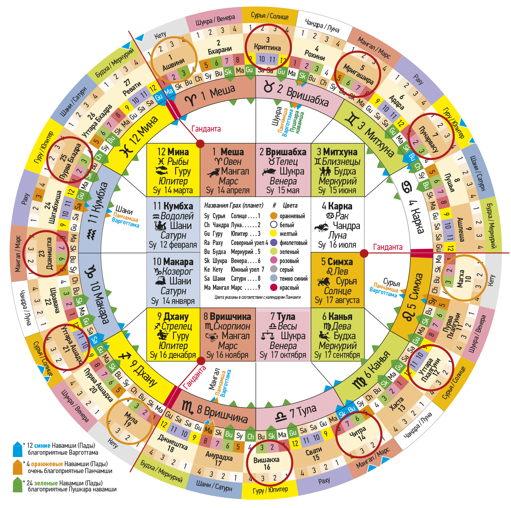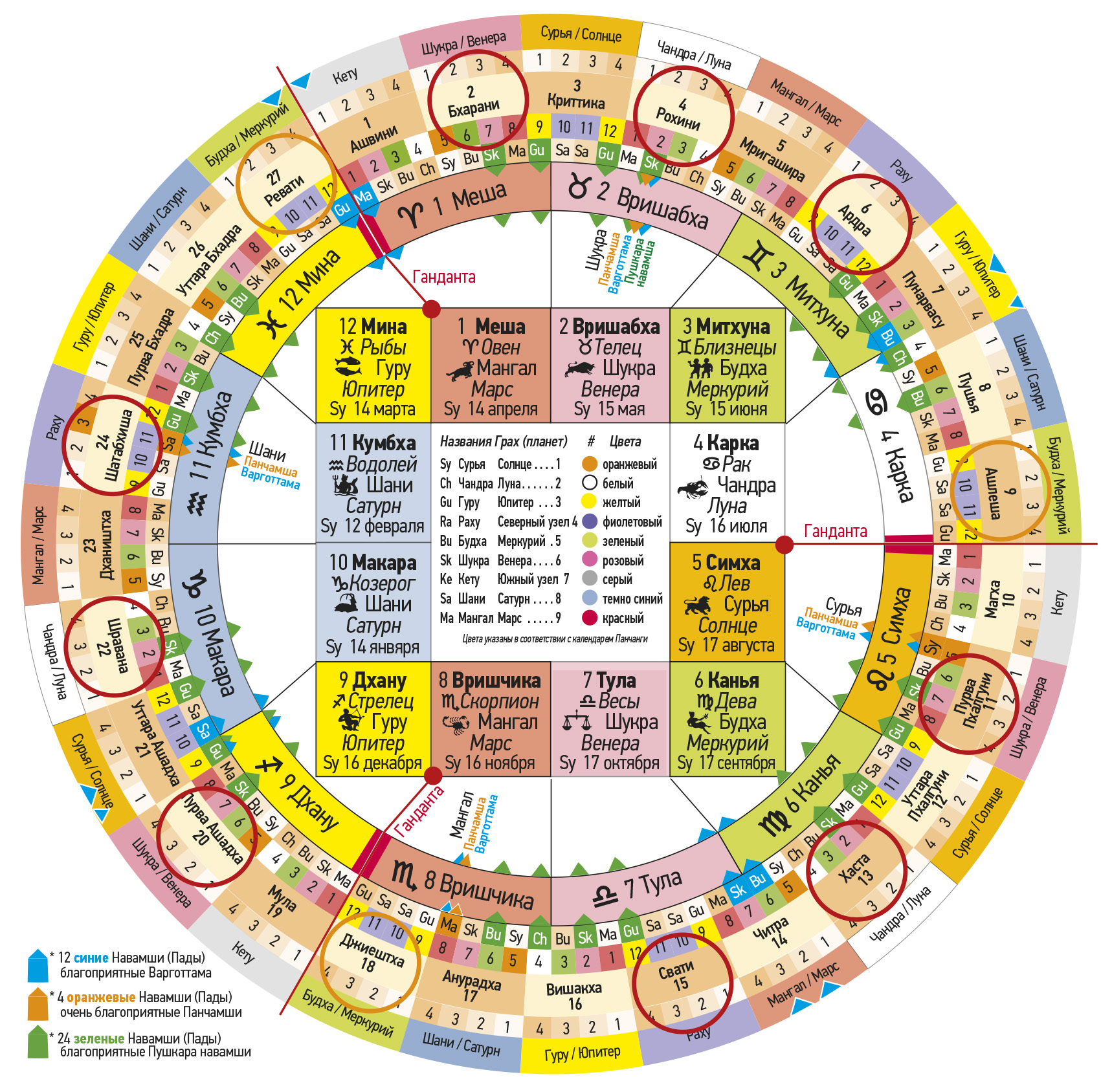 № Первая группа Джанмаркша № Вторая группа Кармаркша № Третья группа Адханаркша Тара Значение Хорошо / Плохо Управляющая планета Пожертвование 4 Рохини 13 Хаста 22 Шравана Джанма Опасность для тела Негативно Луна / Чандра Рис, овощи 5 Мригашира 14 Читра 23 Дхаништха Сампат Богатство и процветание Благоприятно Марс / Мангал 6 Ардра – Вся Накшатра15 Свати – первые 8 ч.24 Сатабхиша – нейтральнаяВипат Потери и несчастные случаи Негативно Раху Пальмовый сахар 7 Пунарвасу 16 Вишакха 25 Пурвабхадра Кшема Процветание Благоприятно Юпитер / Гуру 8 Пушья – Вся Накшатра17 Анурадха – последние 8 ч.26 Уттарабхадра – нейтральнаяПратйак Препятствия и затруднение Негативно Сатурн / Шани Соль 9 Ашлеша 18 Джйештха 27 Ревати Садхана Реализация притязаний Очень хорошо Меркурий / Будха 10 Магха – Вся Накшатра19 Мула – средние 8 ч.1 Ашвини – нейтральнаяНаидхана Опасности, несчастные случаи Очень негативно Кету Сезам, золото 11 Пурвапхалгуни 20 Пурвашадха 2 Бхарани Митра Указывает хорошее Благоприятно Венера / Шукра 12 Уттарапхалгуни 21 Уттарашадха 3 Критика Парама митра Лучший друг Очень б лагоприятн о Солнце / Сурья