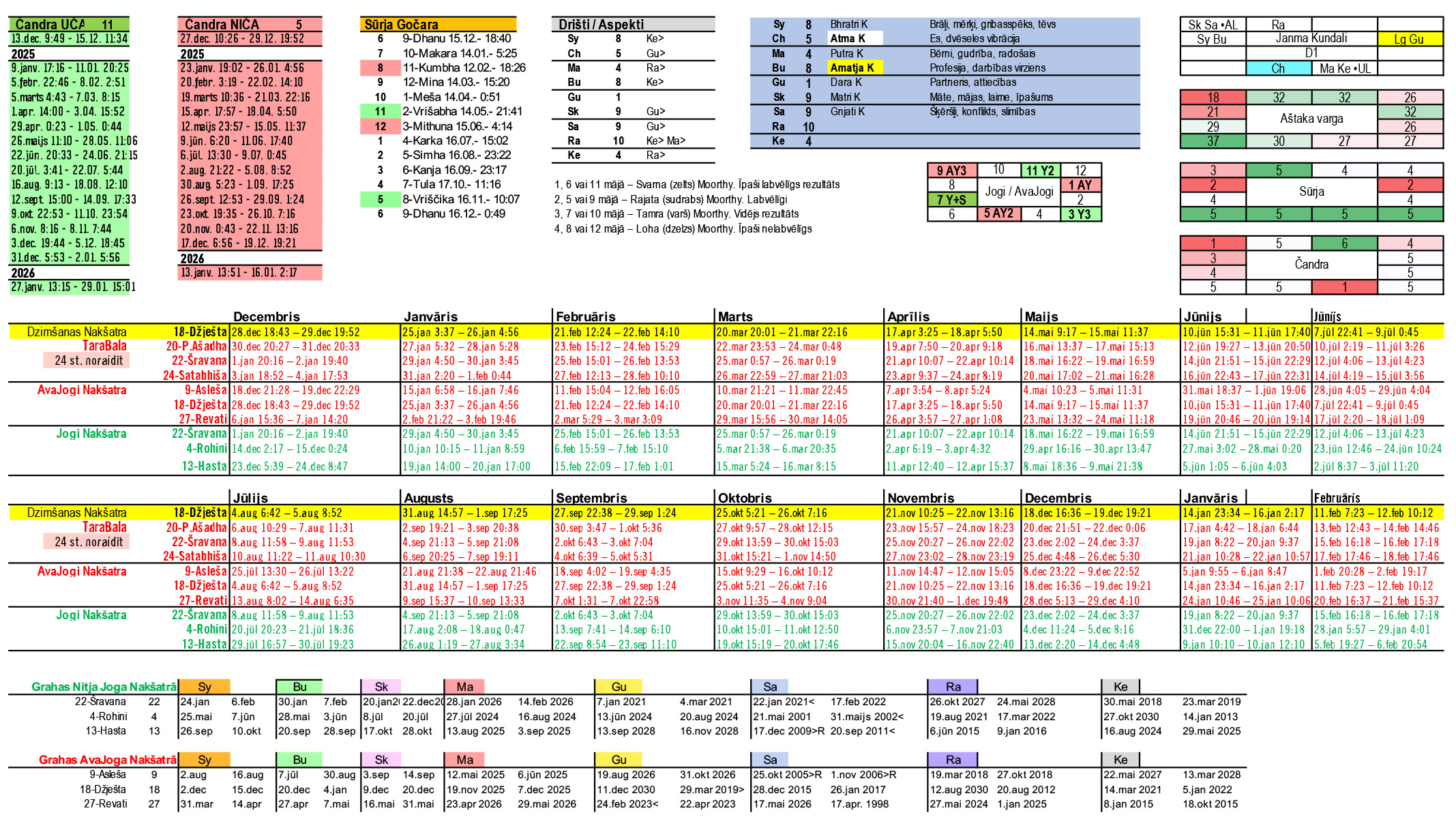 Zinot savu dzimšanas brīža Nitja Jogu, tabulās zemāk variet atrast Jogi un AvaJogi Nakšatras bez aprēķiniem. Tabulas pievienotas Om-1 un Om-2 kalendāriem.